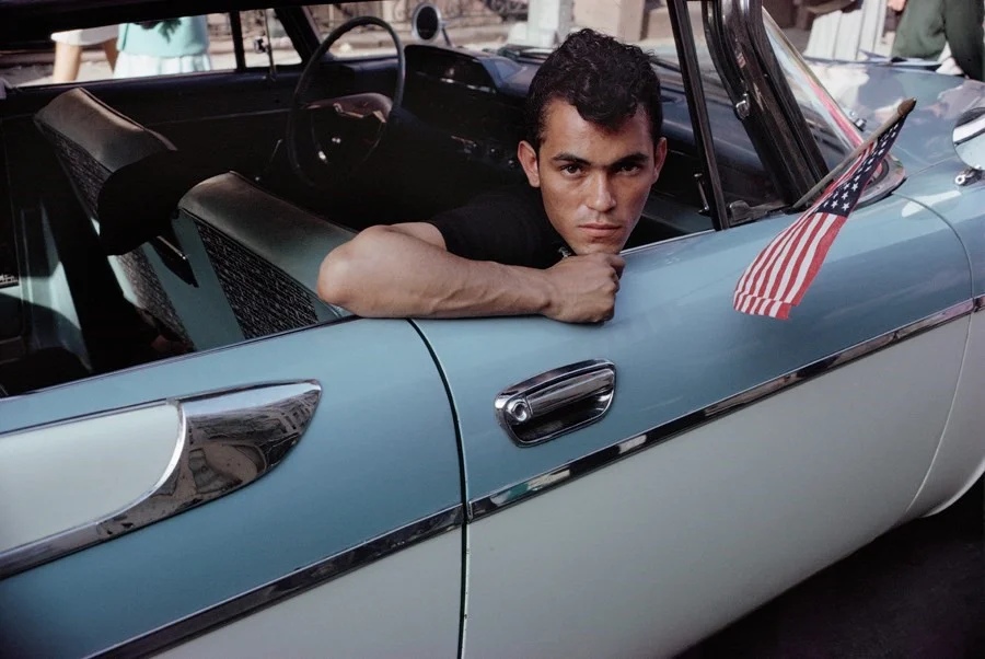 Joel Meyerowitz has his subject framed by the car doors, front seat, and front window.