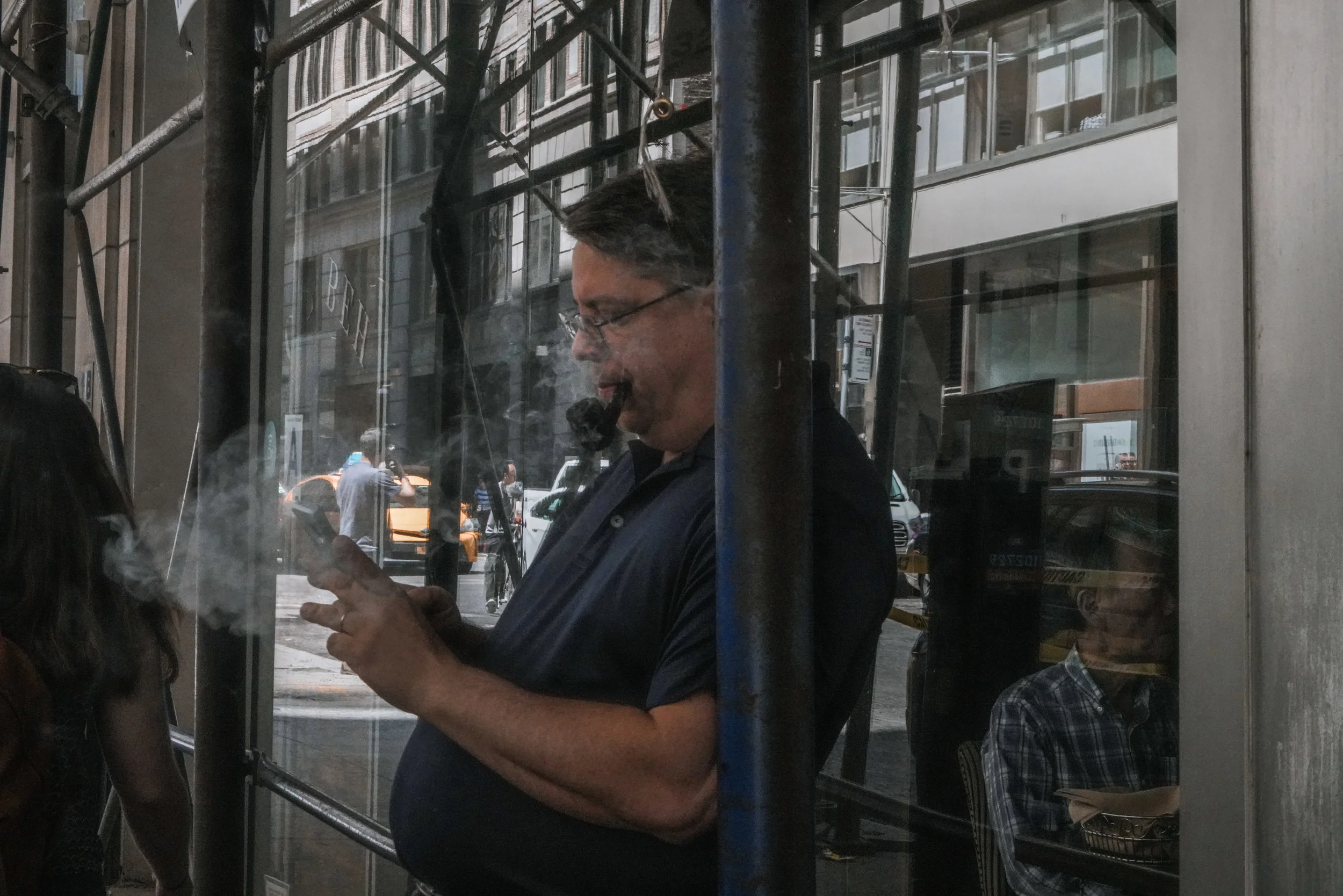In this photo the man with the pipe is framed by the scaffolding and the reflection of the scaffolding that appears in the window. The man sitting inside is framed by the window and his head, though obstructed by the reflection in the window, is framed by the reflection.